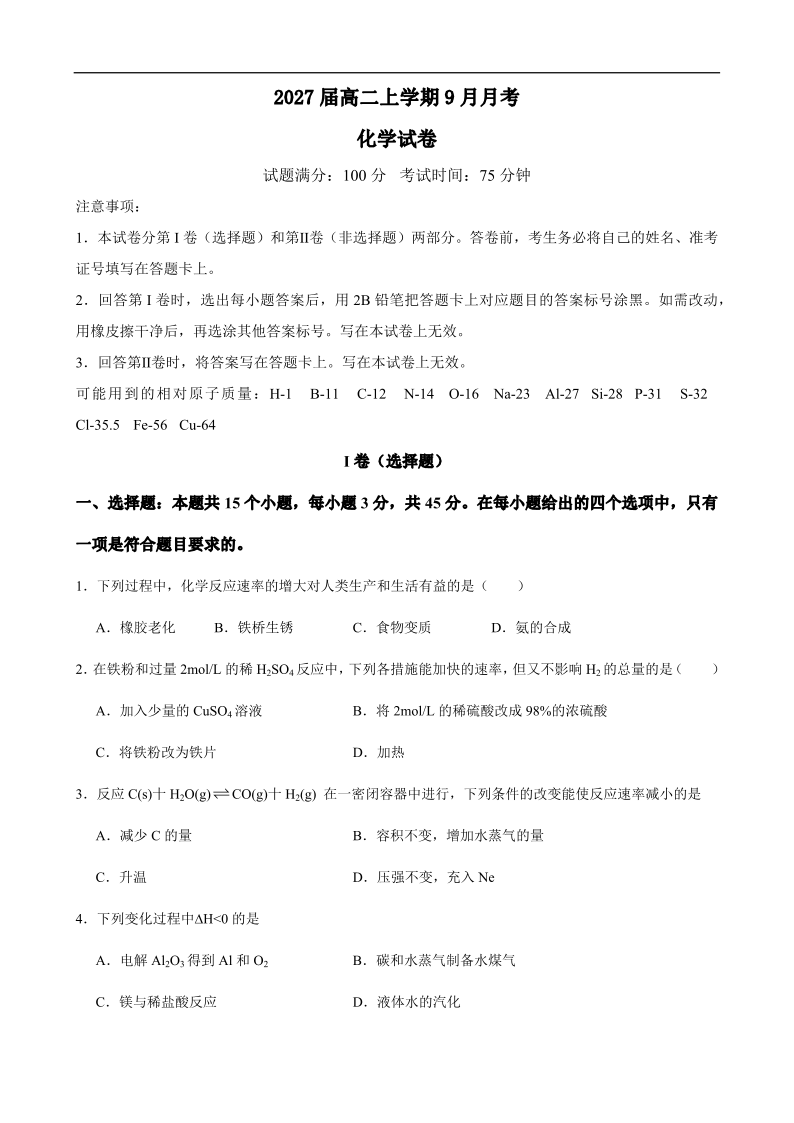 高二化学--四川省眉山市仁寿第一中学校(南校区)2025-2026学年高二上学期9月月考