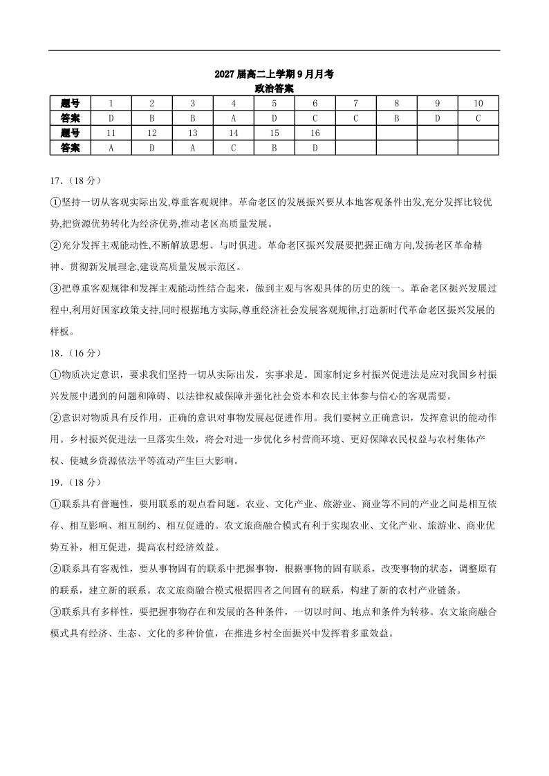高二政治答案--四川省眉山市仁寿第一中学校(南校区)2025-2026学年高二上学期9月月考