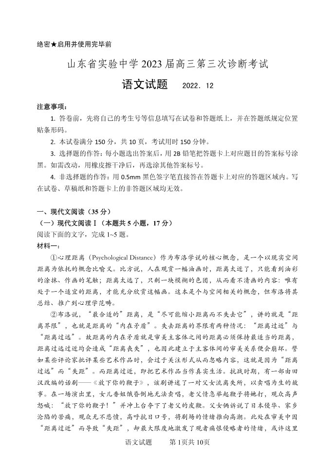 高三语文-山东省实验中学2022-2023学年高三上学期12月第三次诊断考试