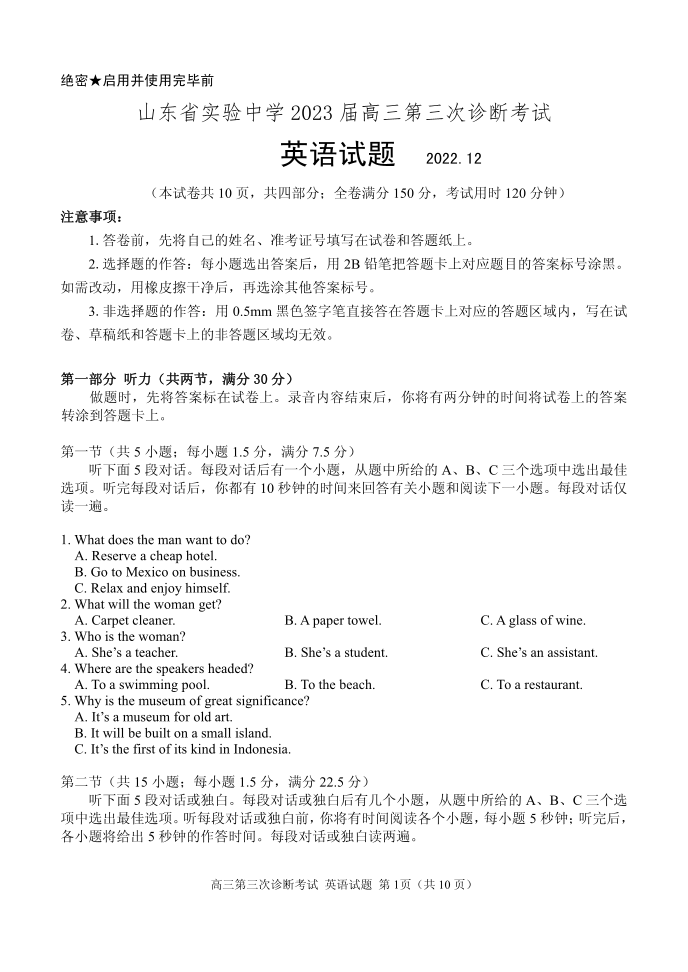 高三英语-山东省实验中学2022-2023学年高三上学期12月第三次诊断考试