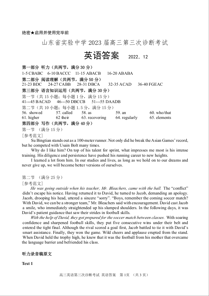 高三英语答案-山东省实验中学2022-2023学年高三上学期12月第三次诊断考试