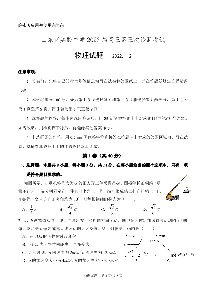 高三物理-山东省实验中学2022-2023学年高三上学期12月第三次诊断考试