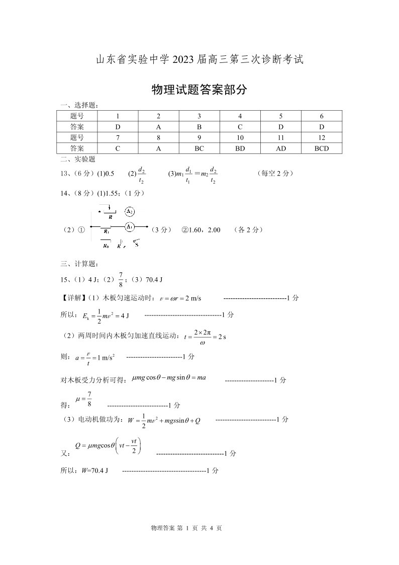 高三物理答案-山东省实验中学2022-2023学年高三上学期12月第三次诊断考试