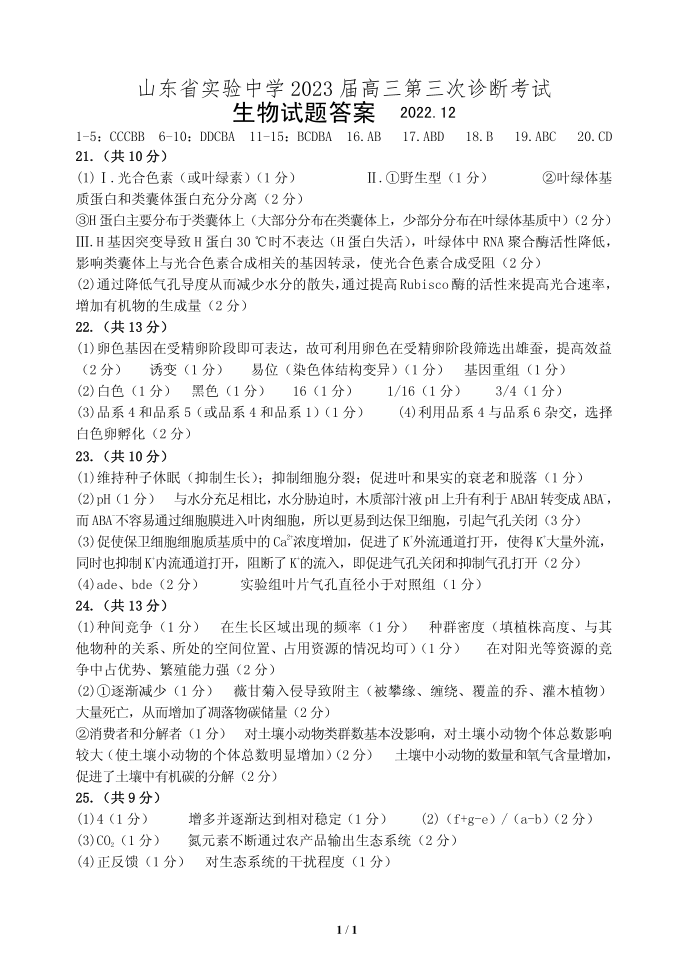 高三生物答案-山东省实验中学2022-2023学年高三上学期12月第三次诊断考试