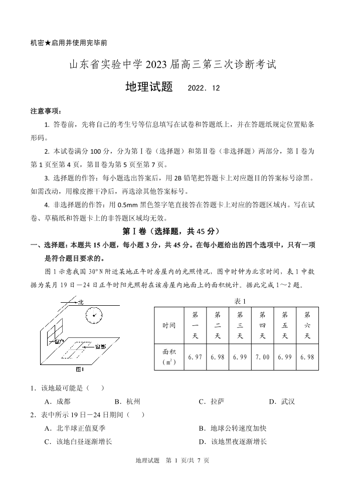 高三地理-山东省实验中学2022-2023学年高三上学期12月第三次诊断考试