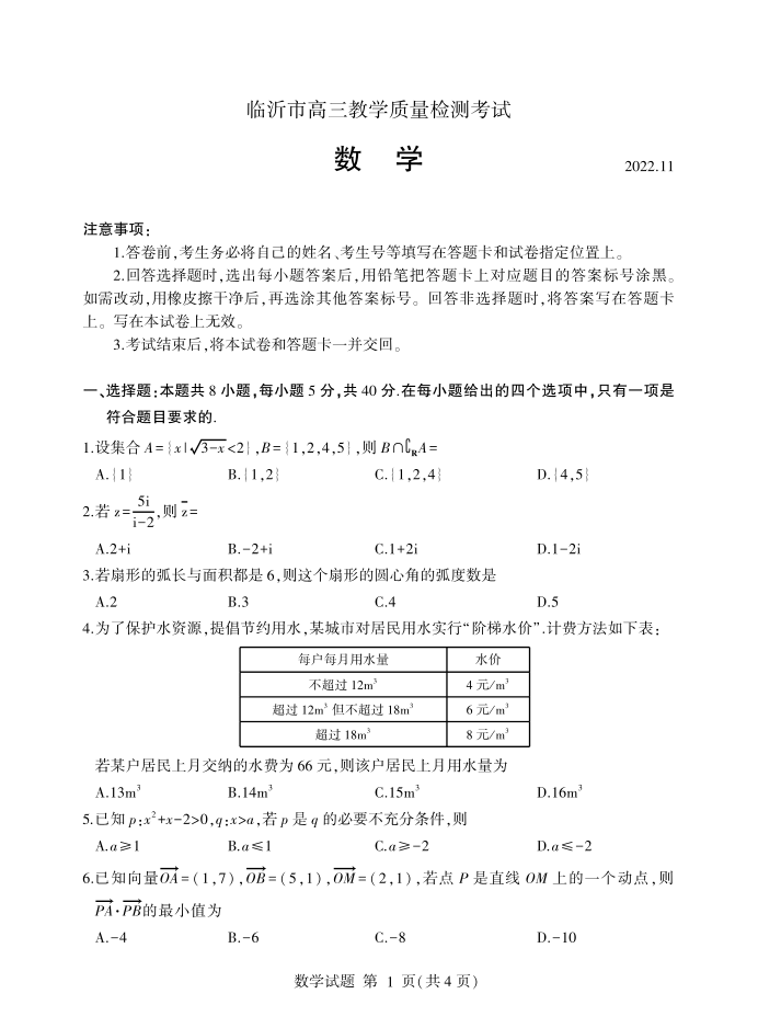 高三数学+答案--山东省临沂市2023届高三上学期期中考试