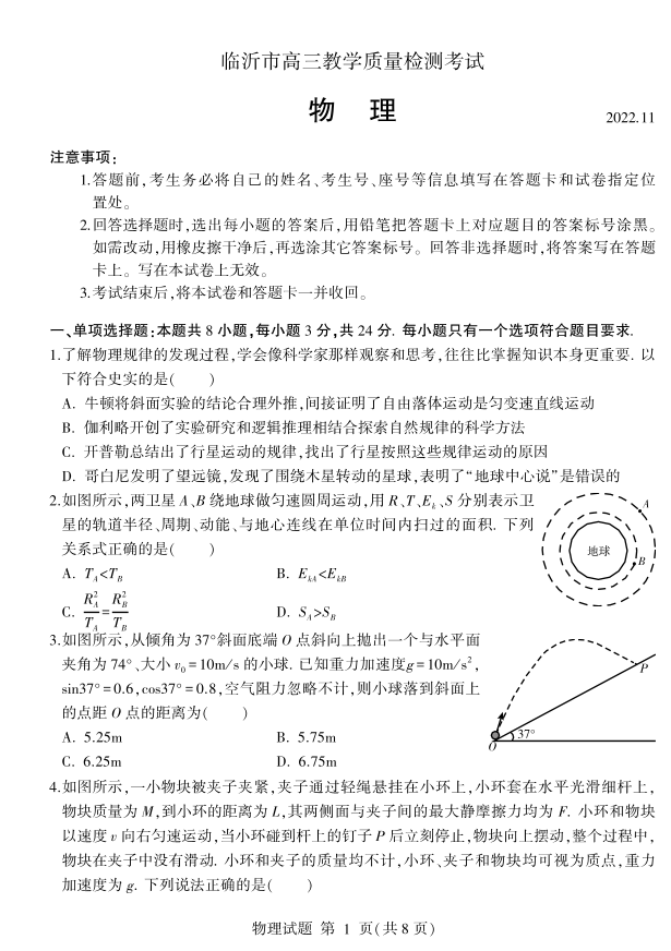 高三物理+答案--山东省临沂市2023届高三上学期期中考试