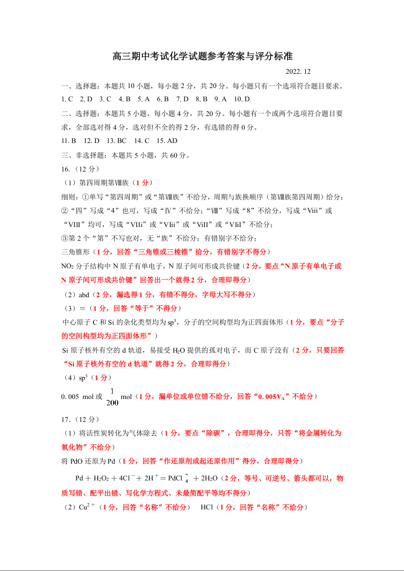 高三化学答案--山东省临沂市2023届高三上学期期中考试