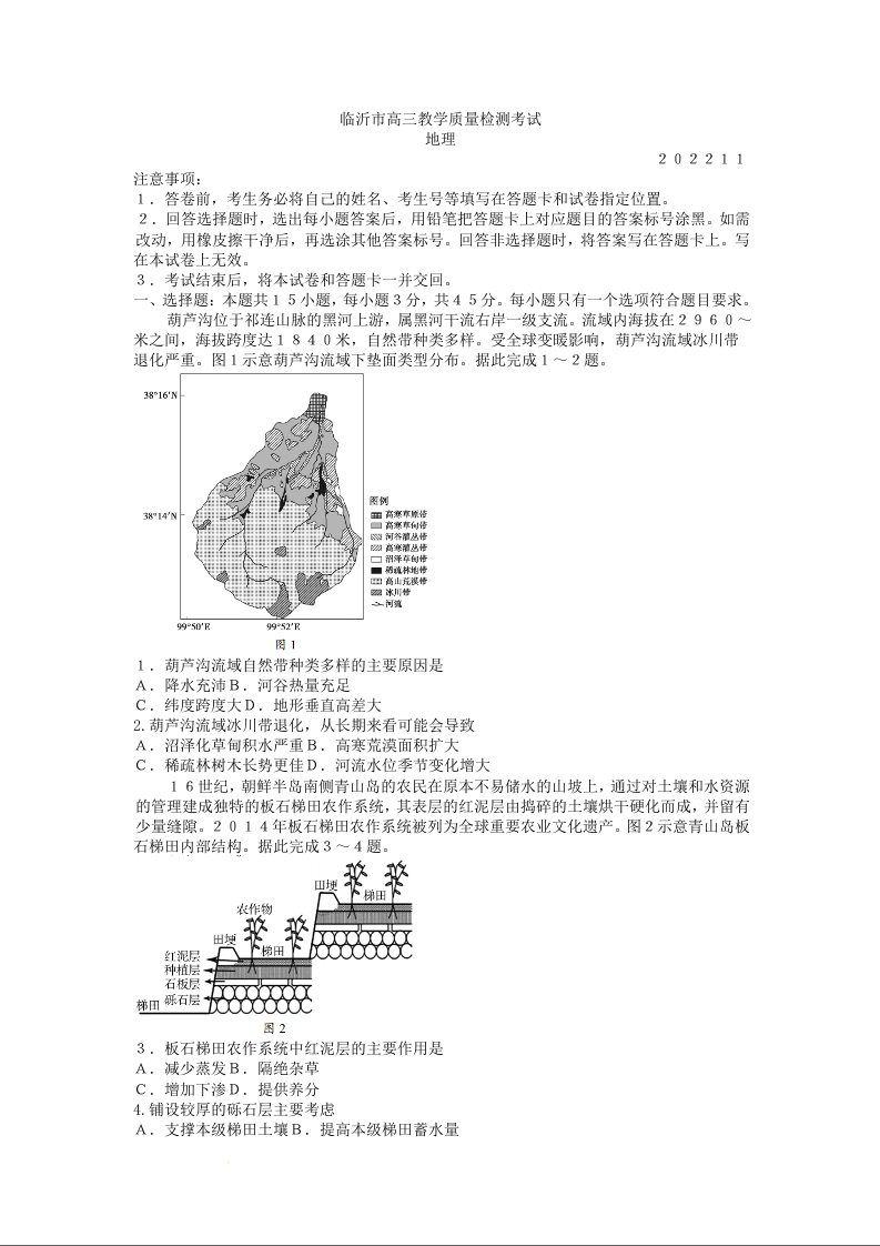 高三地理+答案--山东省临沂市2023届高三上学期期中考试