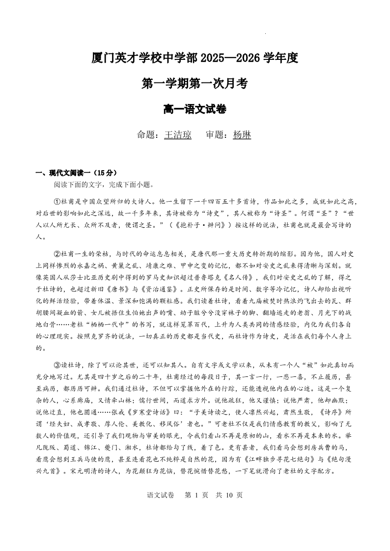 高一语文答案--福建省厦门英才学校2025-2026学年高一上学期第一次月考
