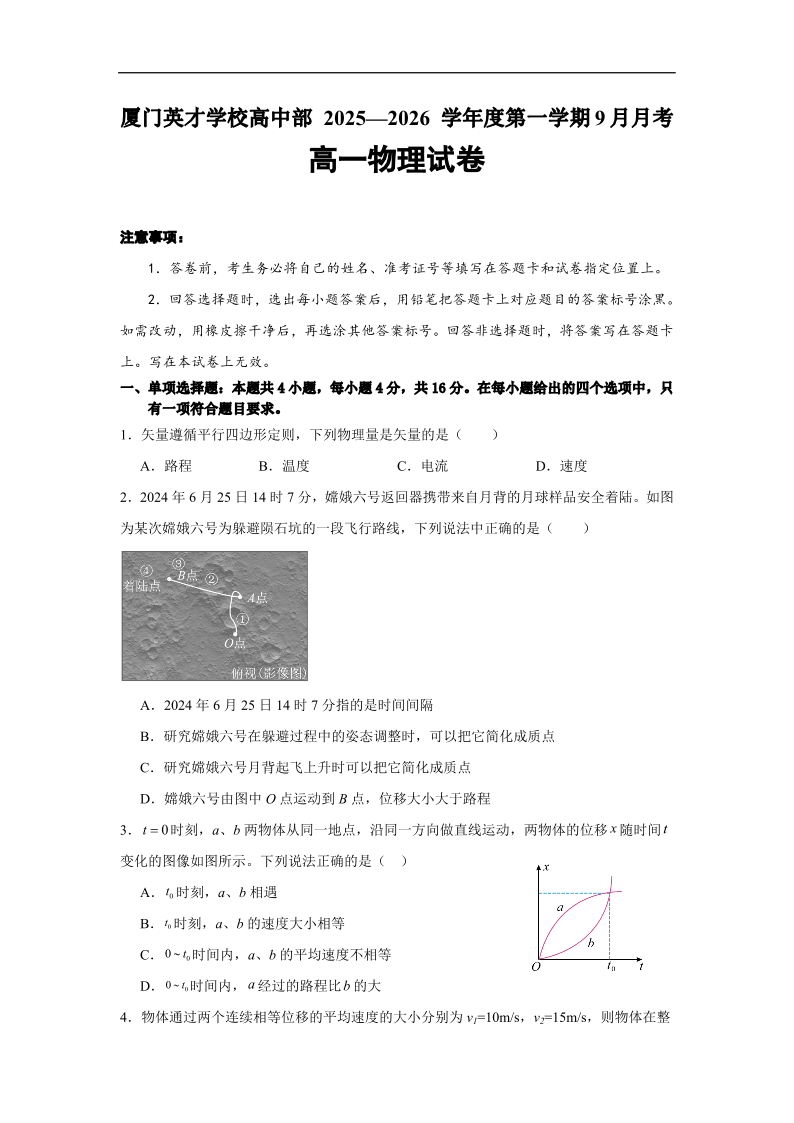 高一物理答案--福建省厦门英才学校2025-2026学年高一上学期第一次月考
