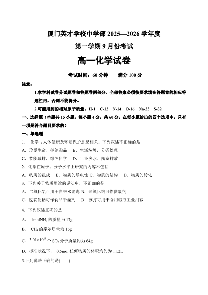 高一化学--福建省厦门英才学校2025-2026学年高一上学期第一次月考