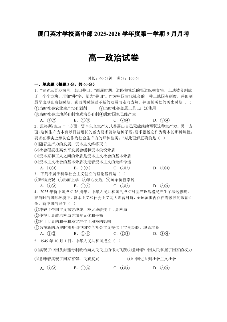 高一政治--福建省厦门英才学校2025-2026学年高一上学期第一次月考