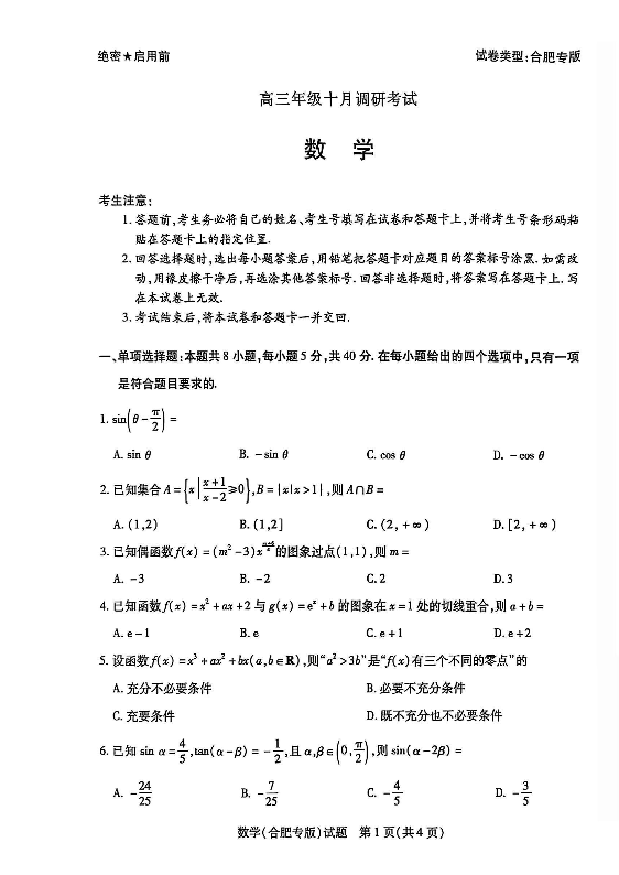 高三数学(合肥专版)--安徽天一大联考豫皖联考2026届高三上学期十月调研考试