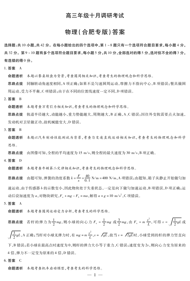 高三物理答案(合肥专版)--安徽天一大联考豫皖联考2026届高三上学期十月调研考试