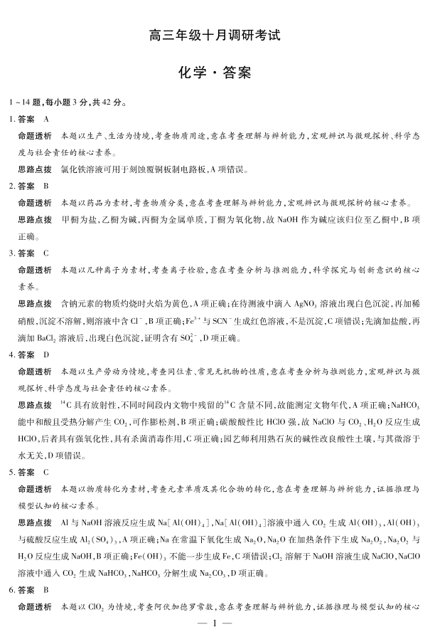 高三化学答案--安徽天一大联考豫皖联考2026届高三上学期十月调研考试