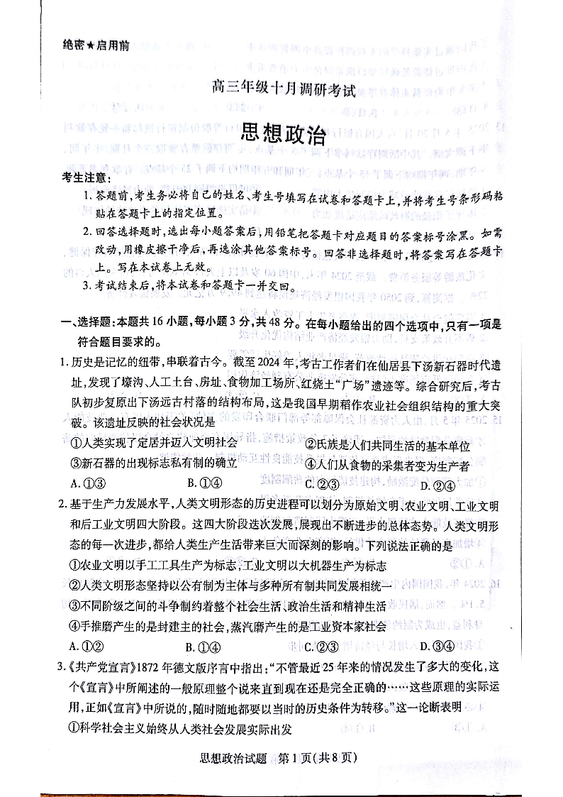 高三政治--安徽天一大联考豫皖联考2026届高三上学期十月调研考试