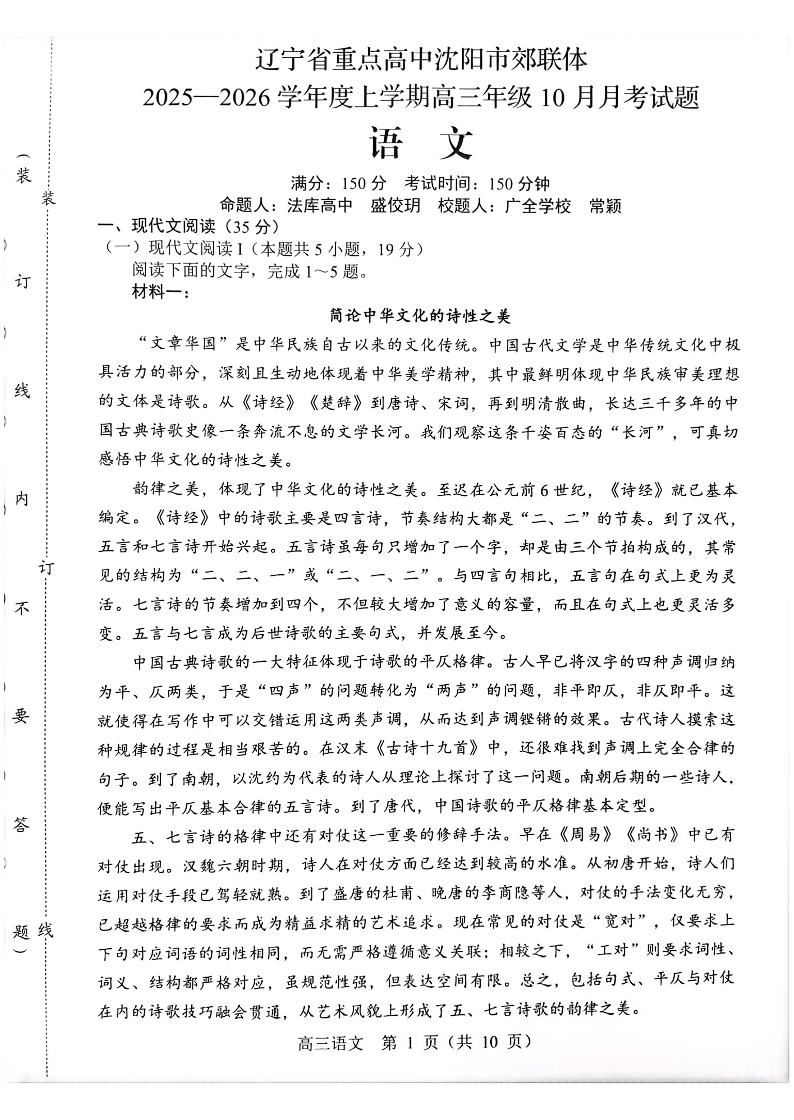 高三语文+答案--辽宁省沈阳市郊联体2026届高三上学期10月月考