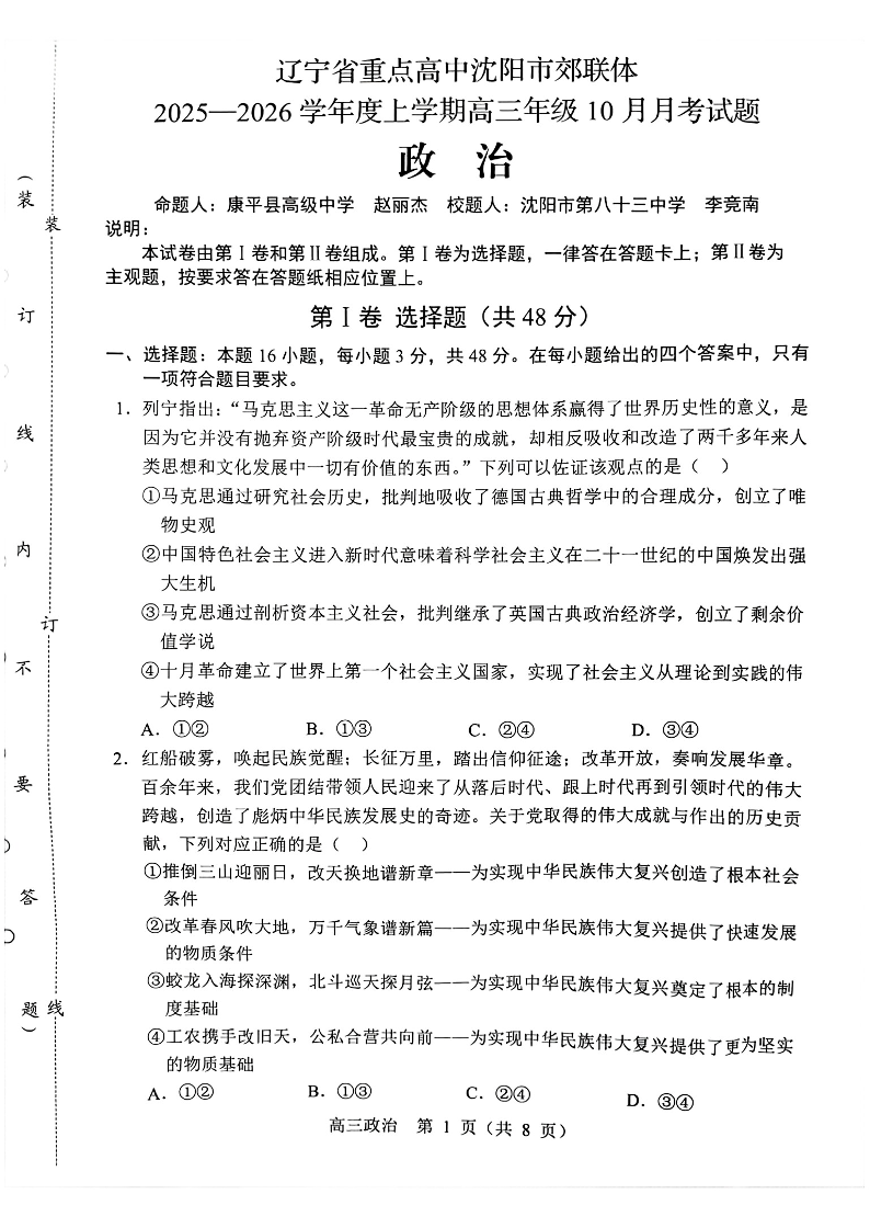 高三政治+答案--辽宁省沈阳市郊联体2026届高三上学期10月月考