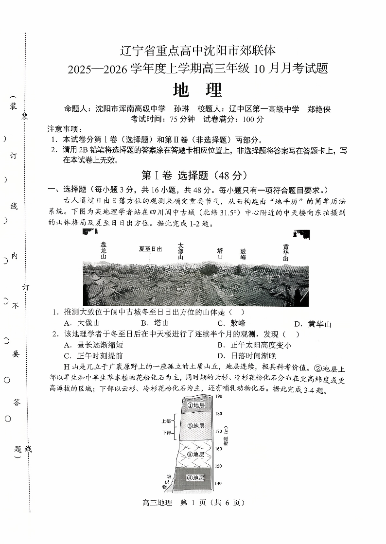 高三地理+答案--辽宁省沈阳市郊联体2026届高三上学期10月月考