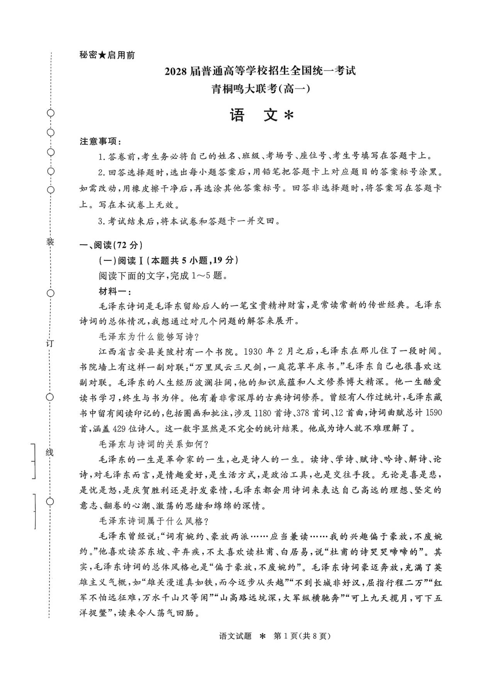 高一语文--河南省青桐鸣高一10月大联考2028届普通高等学校招生全国统一考试