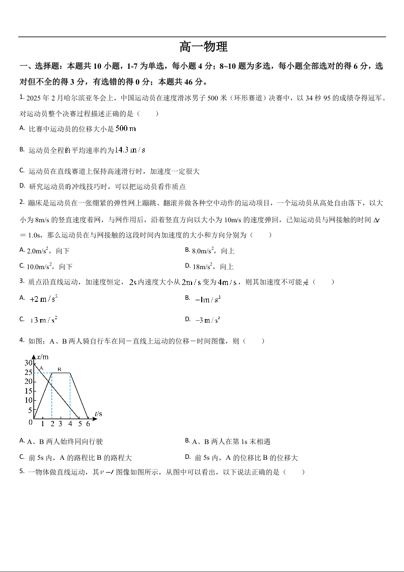 高一物理+答案--吉林省通化市梅河口市第五中学2025-2026学年高一上学期10月月考