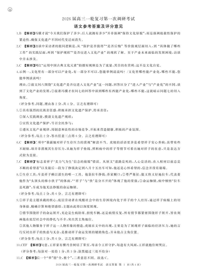高三语文答案--百师联盟2026届高三上学期第一次调研考试(10月)