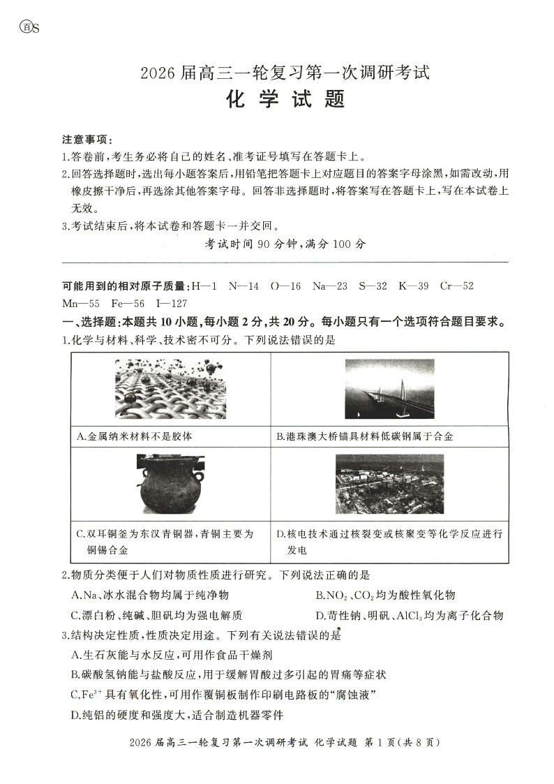 高三化学--百师联盟2026届高三上学期第一次调研考试(10月)