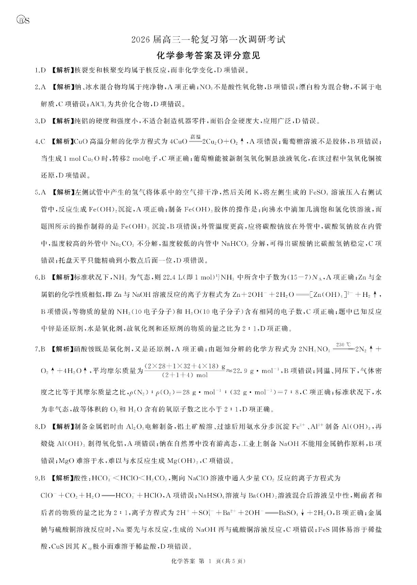 高三化学答案--百师联盟2026届高三上学期第一次调研考试(10月)