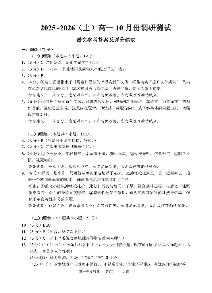 高一语文答案--江苏省南通市2025-2026学年高一上学期10月调研测试