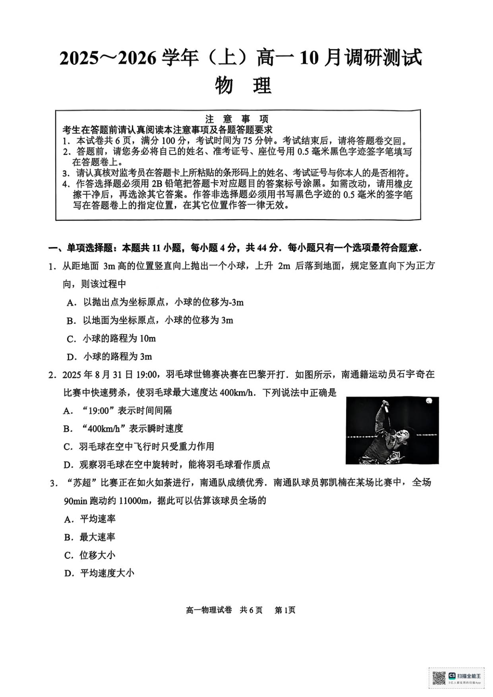 高一物理--江苏省南通市2025-2026学年高一上学期10月调研测试