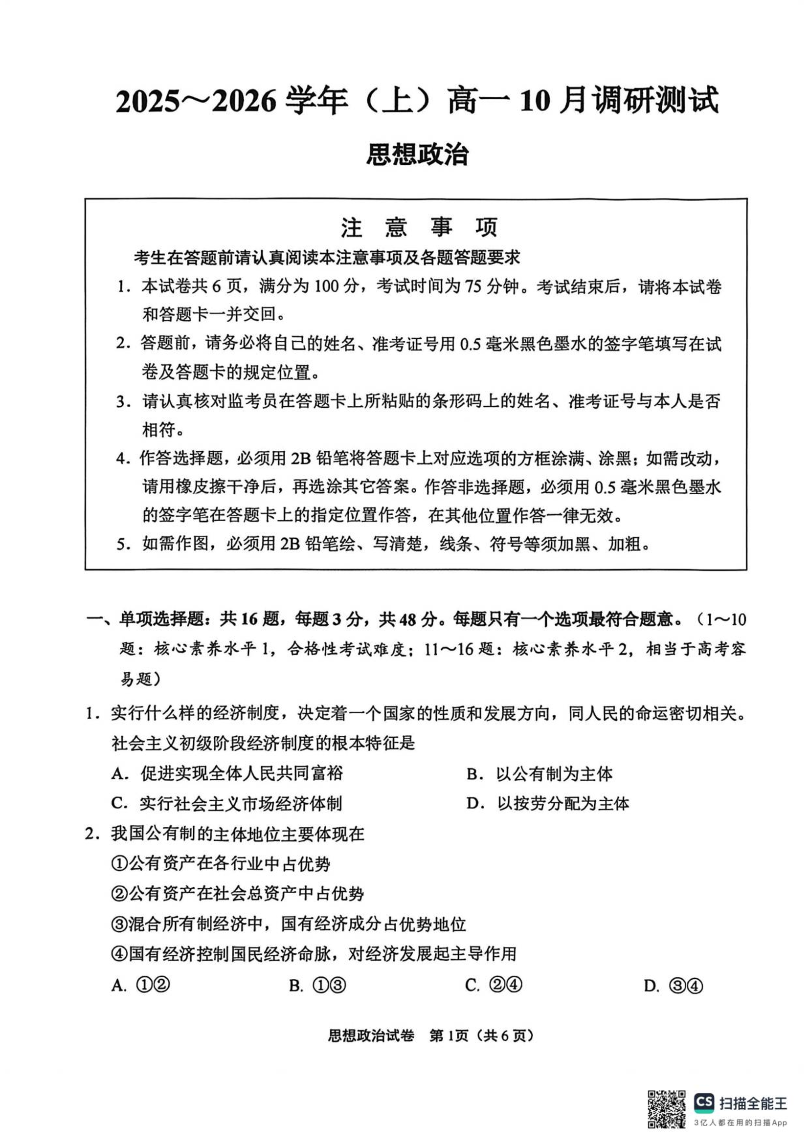 高一政治--江苏省南通市2025-2026学年高一上学期10月调研测试