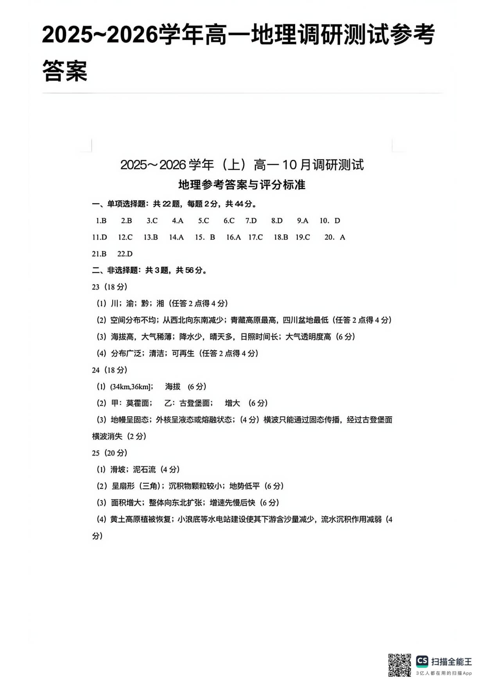 高一地理答案--江苏省南通市2025-2026学年高一上学期10月调研测试