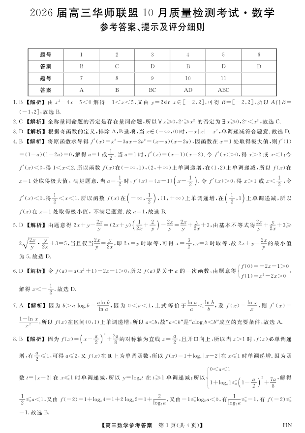 高三数学答案--华师联盟2026届高三10月质量检测考试
