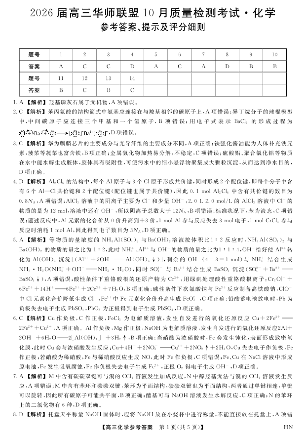 高三化学答案--华师联盟2026届高三10月质量检测考试