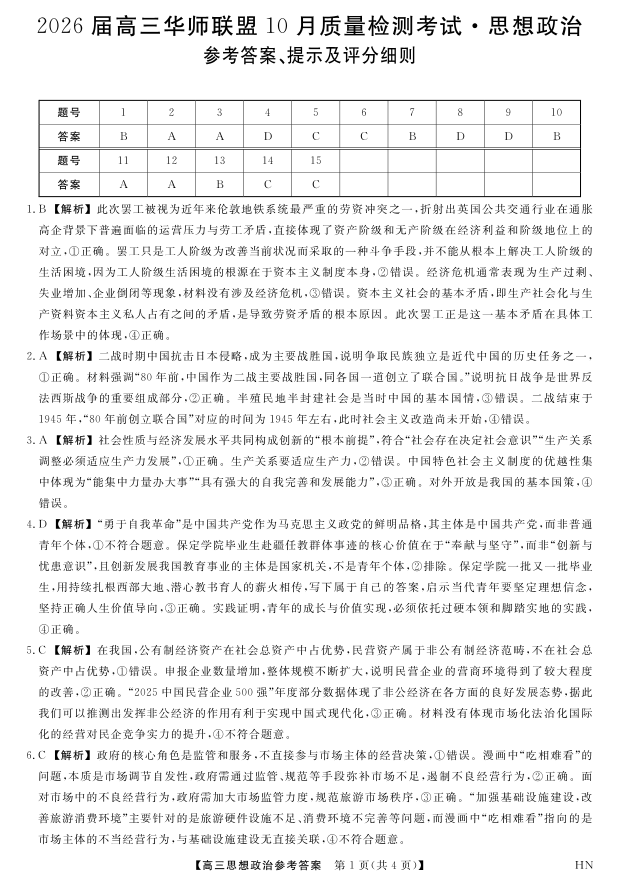 高三政治答案--华师联盟2026届高三10月质量检测考试