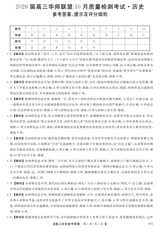 高三历史答案--华师联盟2026届高三10月质量检测考试