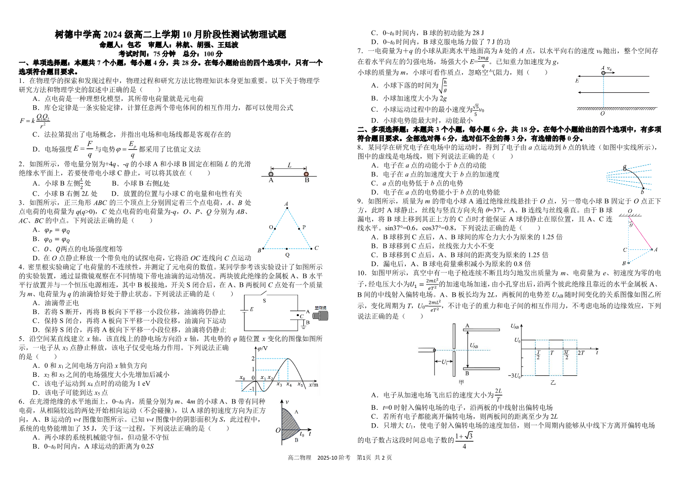 高二物理+答案--四川省成都市树德中学2025-2026学年高二上学期10月月考