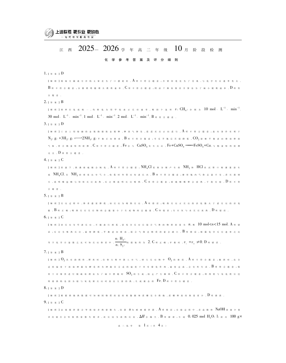 高二化学答案--江西省上进联考2025—2026学年高二年级10月阶段检测