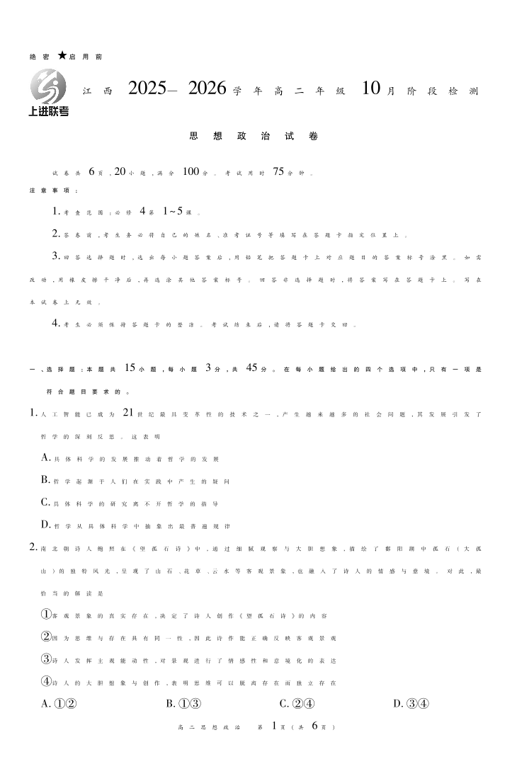 高二政治--江西省上进联考2025—2026学年高二年级10月阶段检测