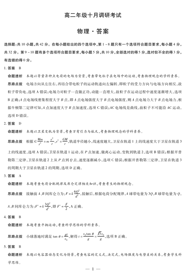 高二物理答案--安徽省天一大联考2025-2026学年高二年级10月调研考试