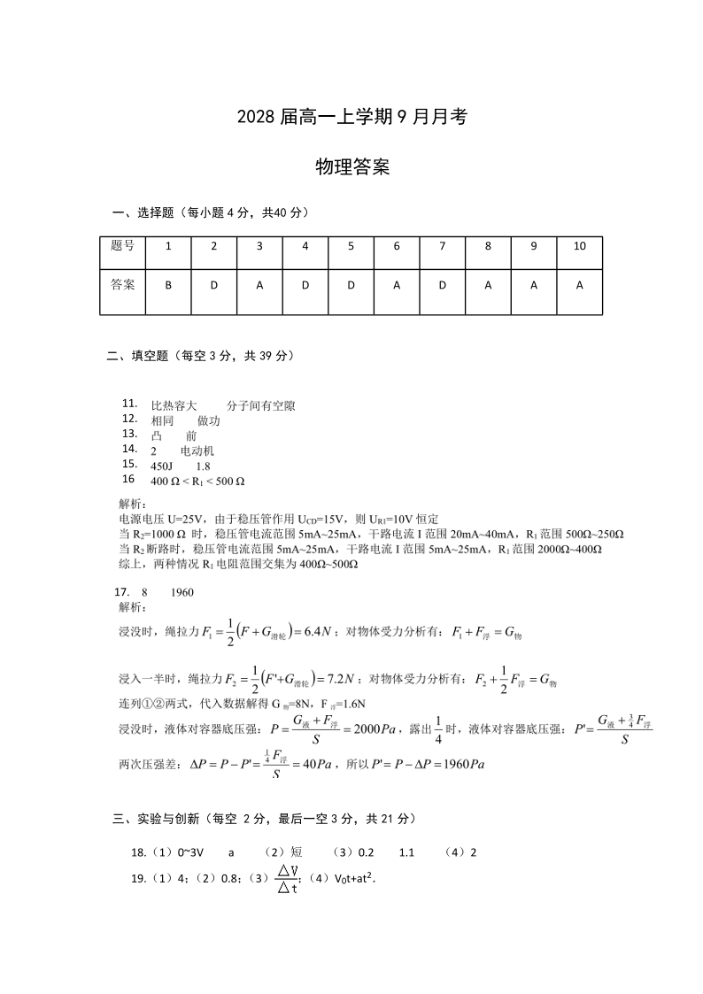 高一物理答案--四川省眉山市仁寿第一中学校(南校区)2025-2026学年高一上学期9月月考