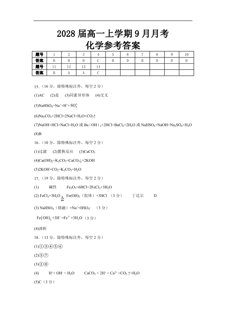 高一化学答案--四川省眉山市仁寿第一中学校(南校区)2025-2026学年高一上学期9月月考