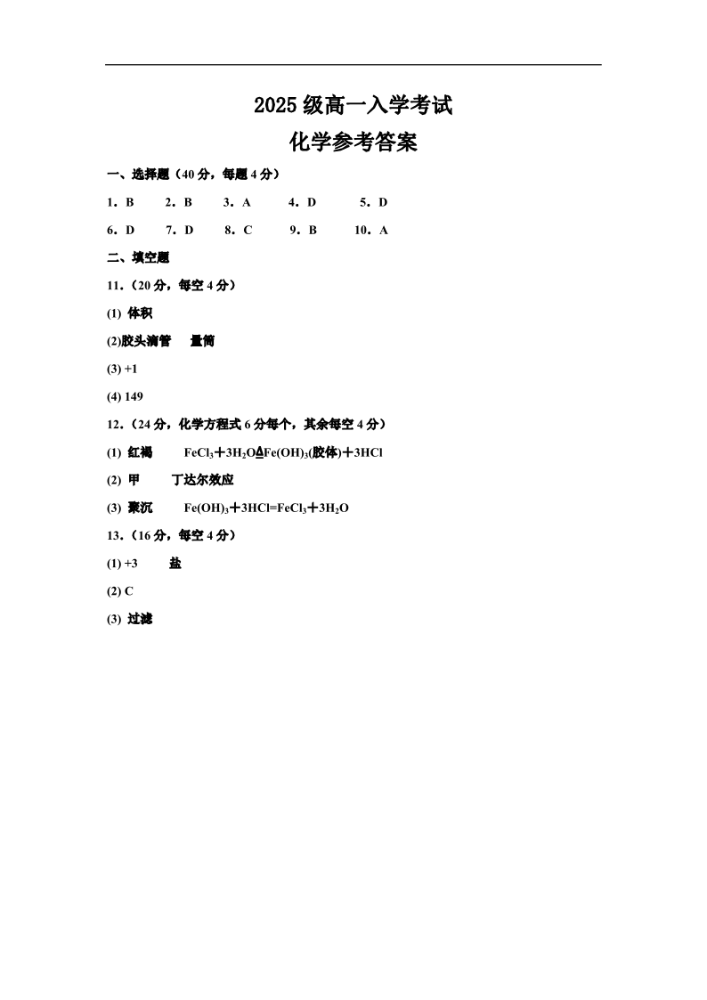 高一化学答案--四川省眉山市仁寿第一中学校(北校区)2025-2026学年高一上学期9月月考