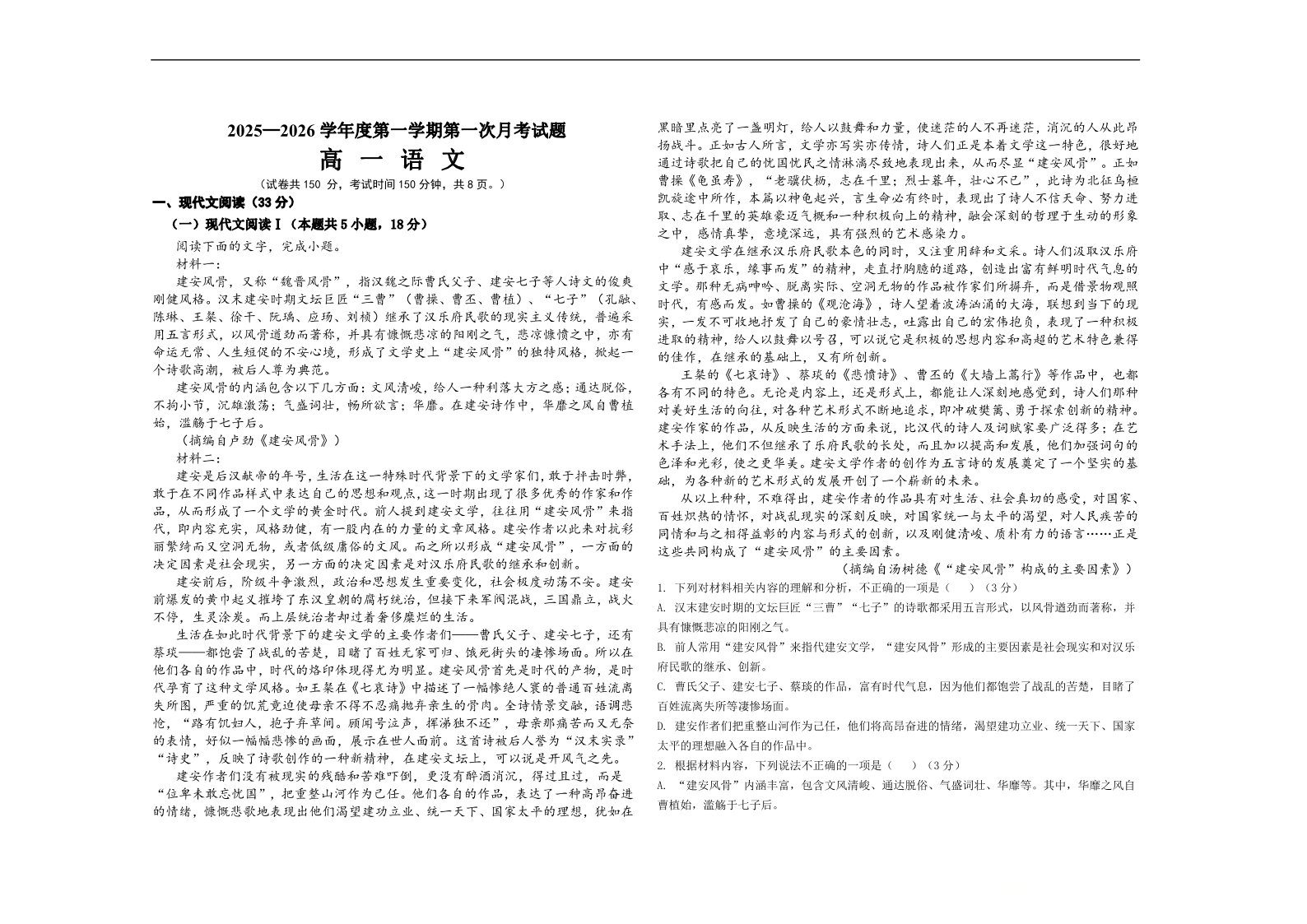 高一语文--陕西省汉中市西乡县第一中学2025-2026学年高一上学期9月月考