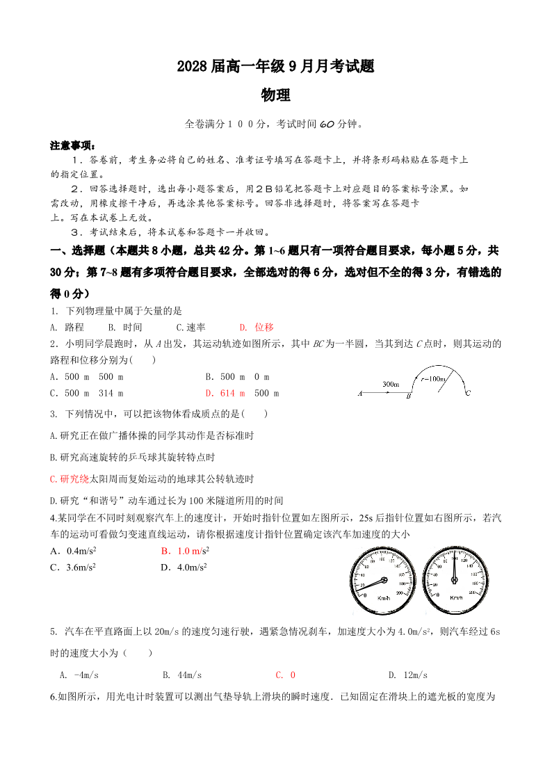 高一物理--陕西省汉中市西乡县第一中学2025-2026学年高一上学期9月月考