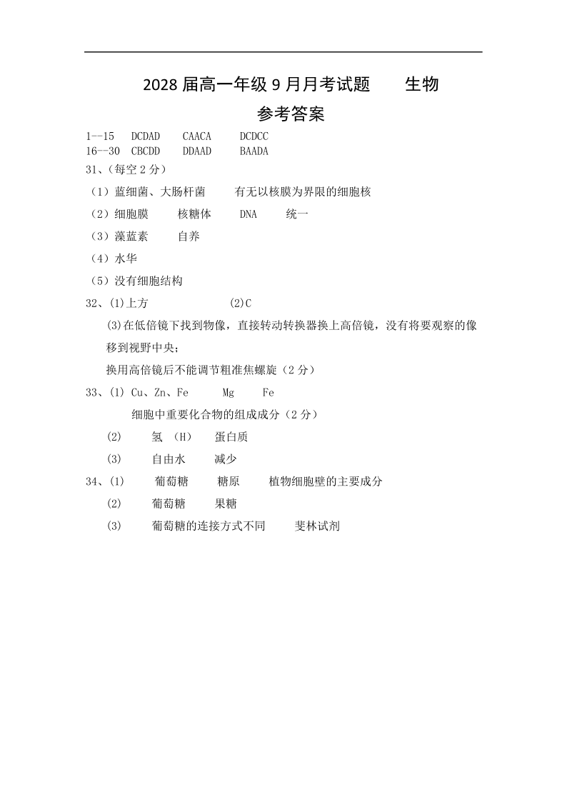 高一生物答案--陕西省汉中市西乡县第一中学2025-2026学年高一上学期9月月考