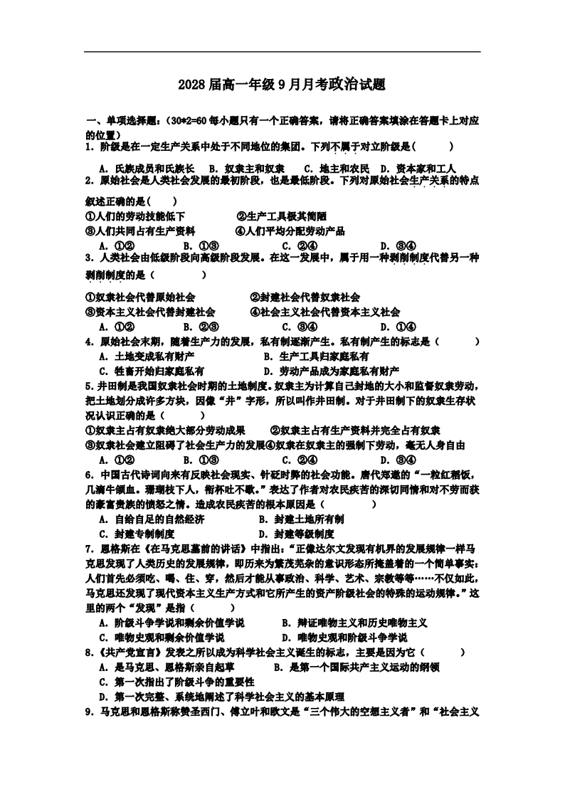高一政治--陕西省汉中市西乡县第一中学2025-2026学年高一上学期9月月考
