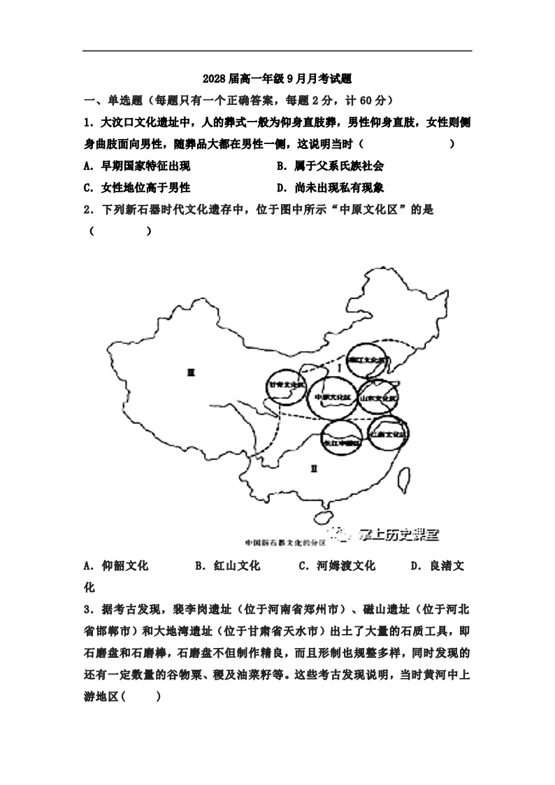 高一历史--陕西省汉中市西乡县第一中学2025-2026学年高一上学期9月月考