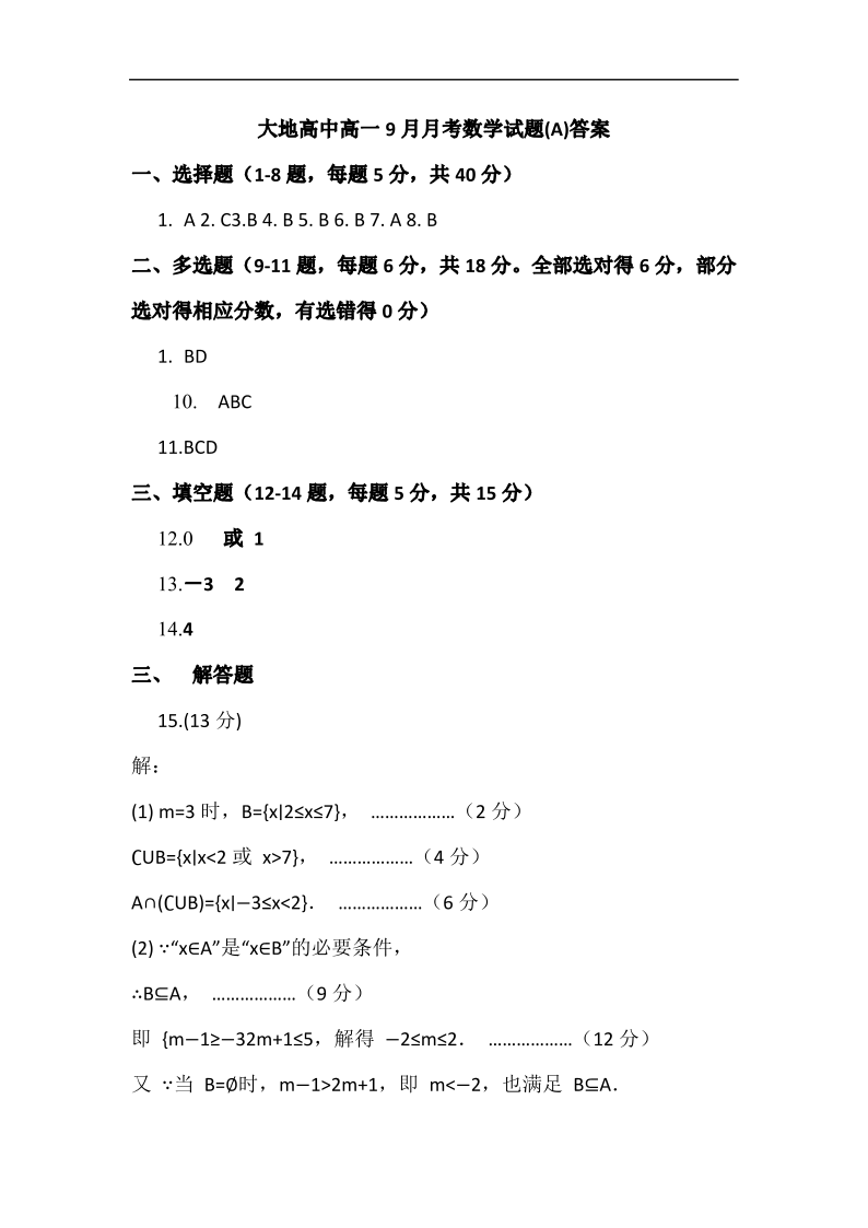 高一数学(A)答案--山西省朔州市怀仁市大地高中学校2025-2026学年高一上学期第一次月考